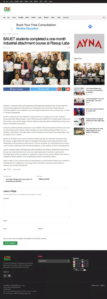 Department of Computer Science and Engineering (CSE) and the Department of Information and Communication Engineering (ICE) students of Bangladesh Army University of Engineering & Technology (BAUET) completed their one-month Industrial Attachment course at Riseup Labs, a next-generation global IT service and technology solution provider company in Bangladesh.
