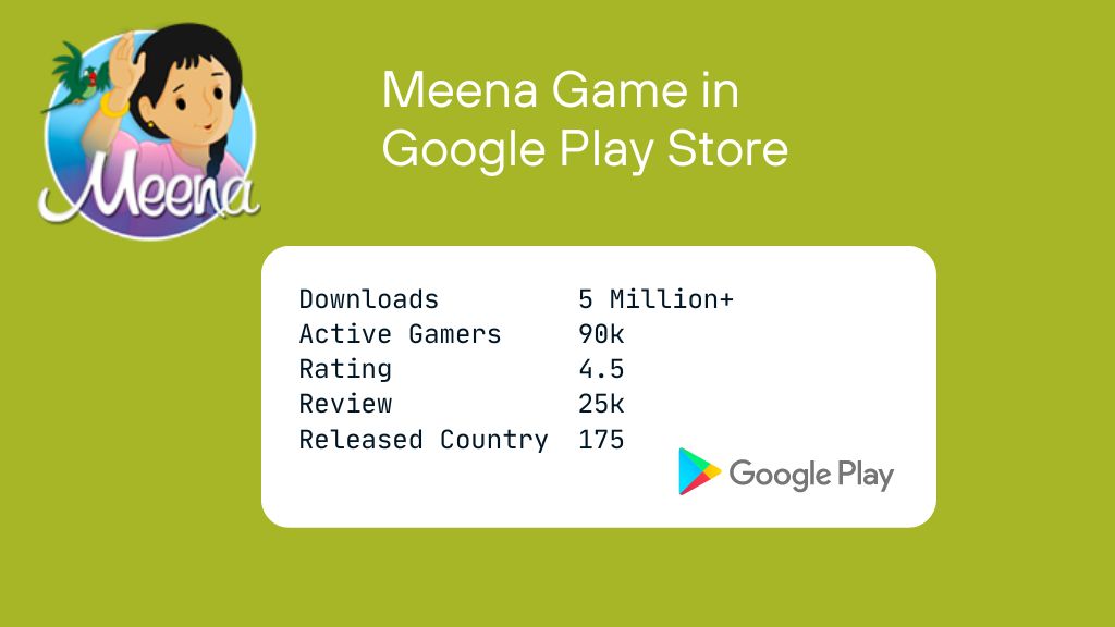 When the first game of this project, Meena Game, was released on 10th December 2016, many gamers were excited to play this game. They started missing their Meena cartoon memories from their youth. More than 5 million people have downloaded the Meena Game from the Google Play Store and the iOS App Store in six years since its release.