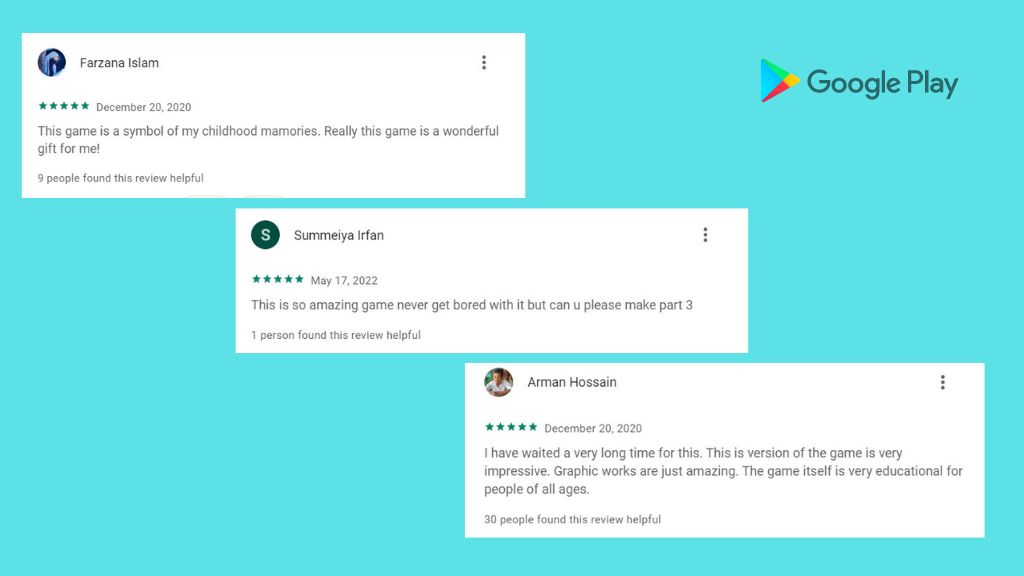 ‘Long awaited release! Been waiting for ages for it to come out, and once I’m finally in.. oh, the nostalgia!!!! All the memories of childhood!!! Wonderful game with the perfect balance of story-driven narrative and gameplay. I can’t wait for the rest. A huge stepping stone for all of us Bangladeshi gamers, playing something designed and developed right here from scratch!! Looking forward to where this takes us.’