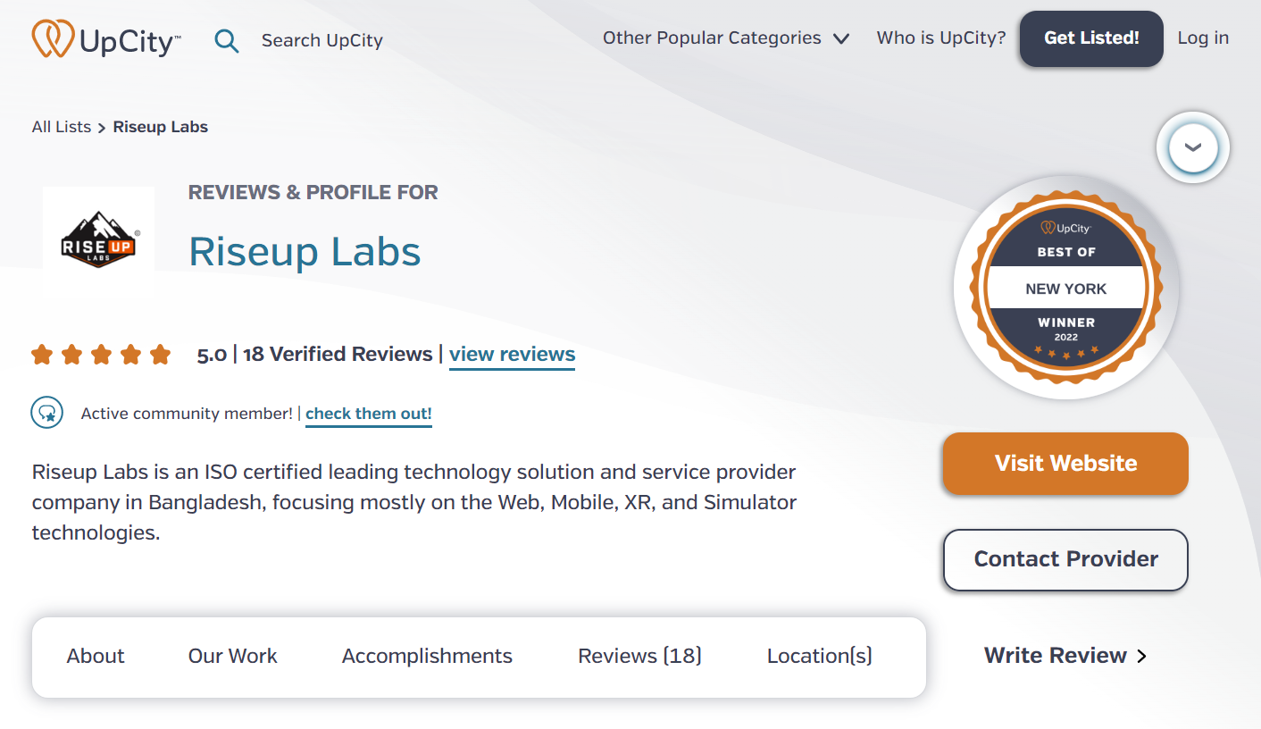 Riseup Labs, the B2B service provider company, is excited to announce that it has won the UpCity Best of New York Award 2022. RUL has achieved the Award for tremendous work as the B2B service provider by UpCity.